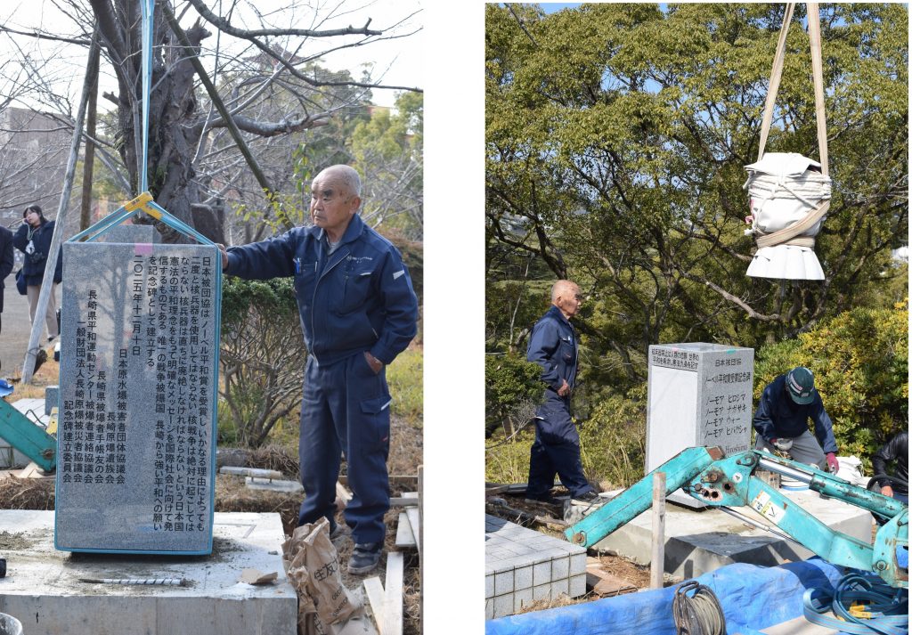 2月13日(金)9:30より2月5日に着工した「日本被団協 ノーベル平和賞受賞記念碑」の建立式が行われ、台座に碑をすえ付ける作業が行われました。