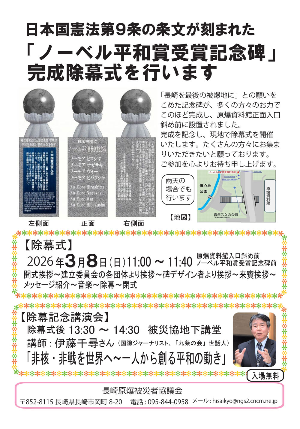 3月8日(日) 日本被団協 ノーベル平和賞受賞記念碑除幕式 2026.02.20 12:59NEW 記念碑の位置~原爆資料館側から見て、右向かいのポストの少し先です カテゴリー:未分類 ツイート お知らせ一覧